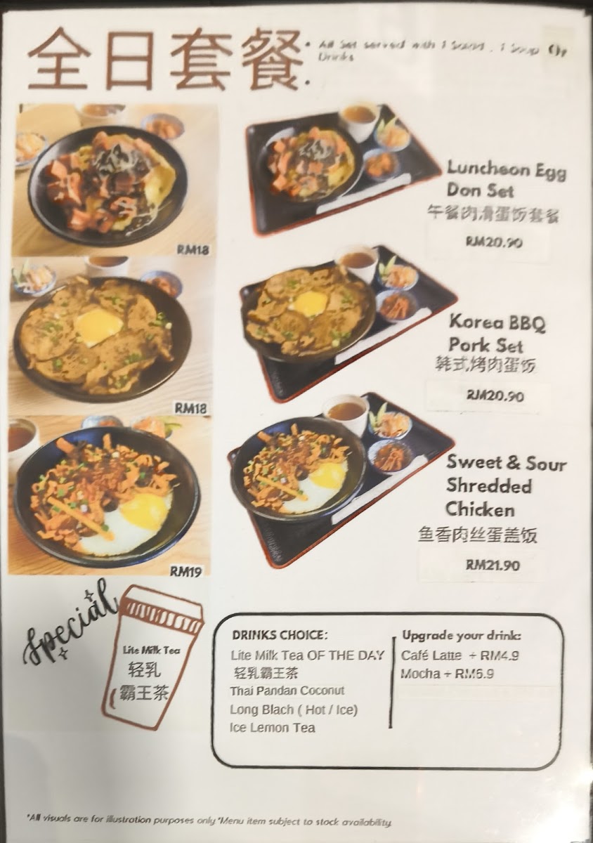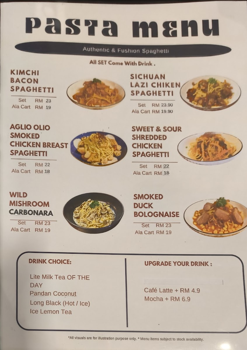 This menu is suitable for those seeking a range of beverages alongside light to moderate meals during daytime hours. The variety supports both quick orders and relaxed dining experiences. The focus remains on providing a mix of coffee-centric drinks and fusion-style food choices.